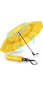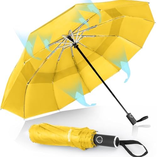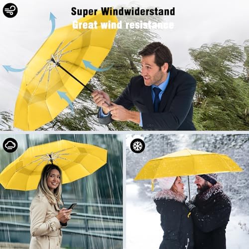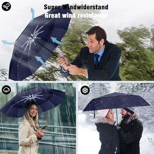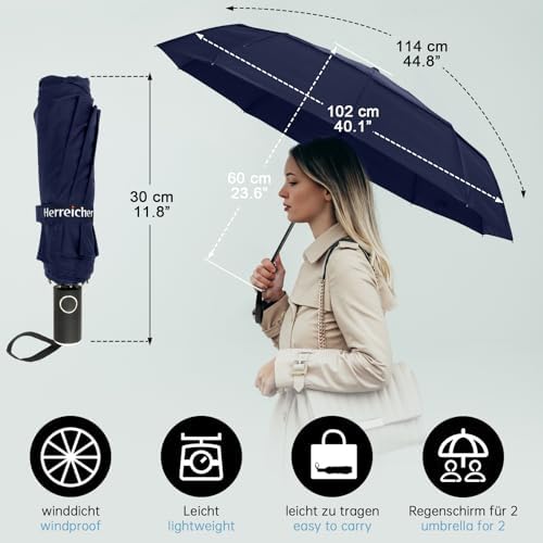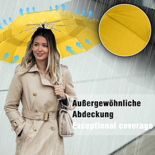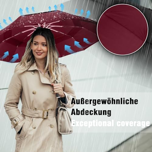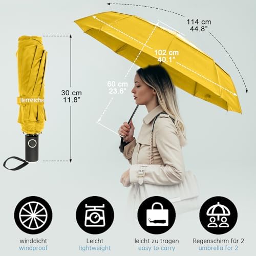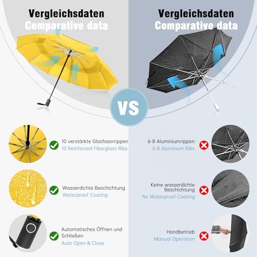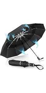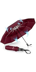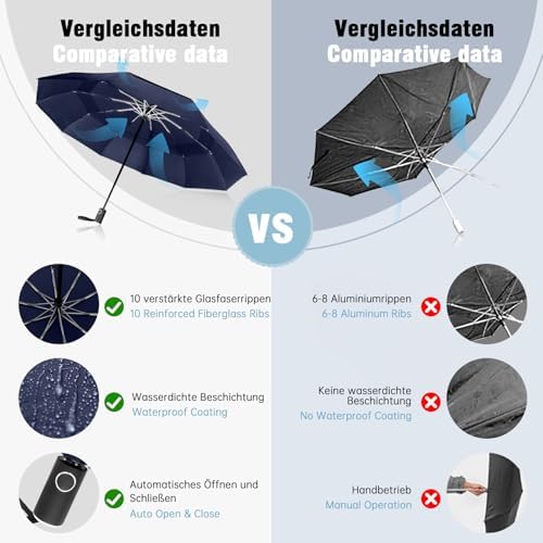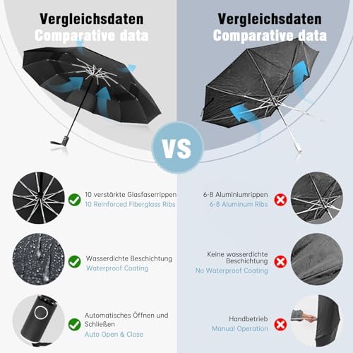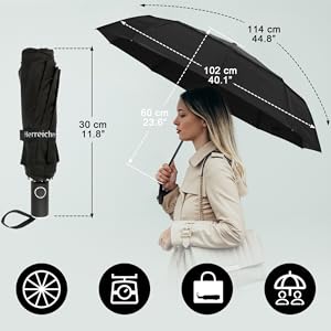 Mit einer einzigartigen 10-fach Verstrebung übertrifft dieser Regenschirm herkömmliche Modelle, die nur 6 bis 8 Streben bieten. Dank der flexiblen Zugfedern und der Rahmenkonstruktion aus glasfaserverstärktem, rostfreiem Qualitätsstahl ist er besonders stabil und bruchsicher. Dieser Regenschirm ist der zuverlässige Begleiter, den Sie bei starkem Wind und Regen benötigen.