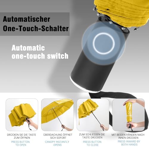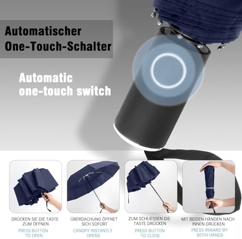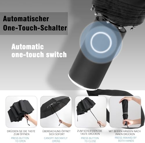 Dank der intelligenten Einknopf Auf-Zu-Automatik eröffnet und schließt dieser Regenschirm mit nur einem Knopfdruck. Ein rutschfester, gummierter Griff sorgt dafür, dass der Schirm Ihnen auch bei nassen Bedingungen nicht aus der Hand gleitet. So lässt sich der Schirm bequem und schnell handhaben – ideal für unvorhersehbare Regenschauer.