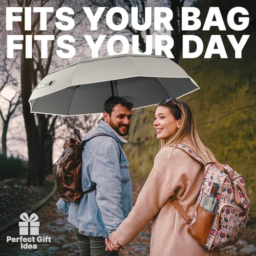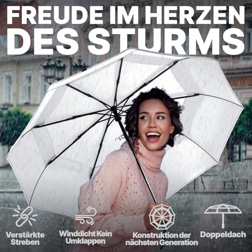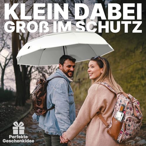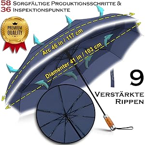 Unser neuester Taschen-Regenschirm zeichnet sich durch eine innovative, belüftete Doppeldach-Konstruktion aus. Diese wurde mehrfach verbessert, um besonders windsicher zu sein. Der Rahmen besteht aus hochwertigem, super windabweisendem Fiberglas sowie einem erstklassigen Stahlrahmen. Die speziellen Belüftungsöffnungen ermöglichen es dem Wind, durchzuströmen, wodurch ein Kippen oder Brechen des Schirms verhindert wird.