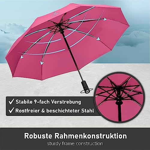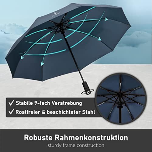 Die 9 Fiberglas verstärkten Metallstreben und der extra breite Schaft sorgen für eine herausragende Stabilität. Selbst bei starken Winden von bis zu 140 km/h bleibt dieser Regenschirm Ihr zuverlässiger Schutz. Vertrauen Sie auf Sicherheit und Langlebigkeit, egal wie herausfordernd die Wetterbedingungen sind.