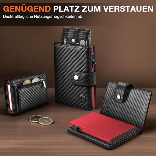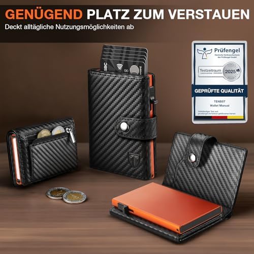 Unser ALL-IN-ONE Portemonnaie bietet Ihnen eine durchdachte Lösung für die moderne Geldaufbewahrung. Es bietet Platz für bis zu 10 Karten, inklusive eines innovativen Pop-up-Kartenhalters, der bis zu 6 Karten auf Knopfdruck elegant präsentiert. Darüber hinaus bietet die Geldbörse 4 zusätzliche Kartenfächer sowie ein praktisches Ausweisfenster für Ihren Personalausweis.
