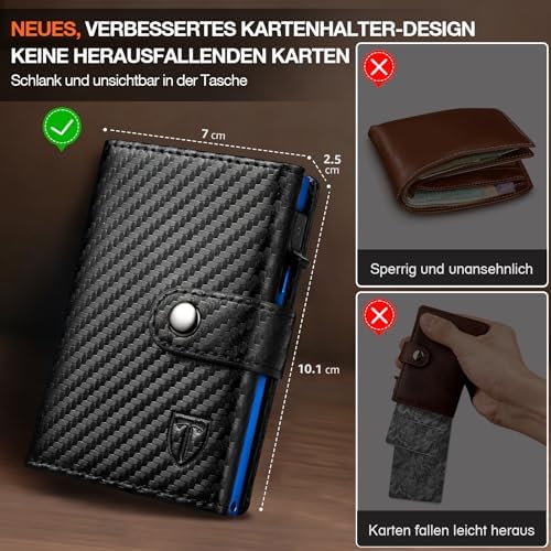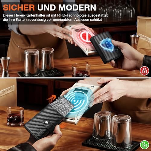 Die Kombination aus hochwertigem Kohlefaser-Kunstleder und einem modernen, stilvollen Design hebt unseren Kartenhalter von gewöhnlichen Modellen ab. Er ist nicht nur funktional, sondern auch ein echter Hingucker, der sowohl in der Freizeit als auch im professionellen Umfeld überzeugt.