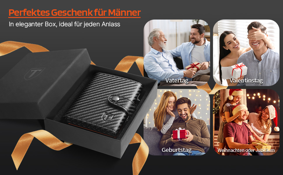 Die Herren Geldbörse wird in einer stilvollen Geschenkbox geliefert, die eine Postkarte zum Schreiben von Glückwünschen enthält. Dieses macht sie zur idealen Geschenkidee für zahlreiche Anlässe wie Geburtstage, Hochzeiten, Vatertage, Weihnachten, Ostern und Valentinstag.
