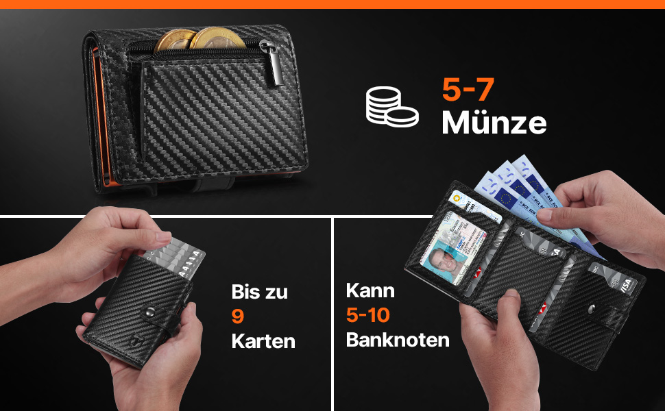 Hergestellt aus hochwertigem Leder mit einer Carbonfaseroptik, bietet diese Geldbörse nicht nur ein weiches und angenehmes Gefühl, sondern überzeugt auch durch hervorragende Wasser- und Abriebfestigkeit. Die robuste Bauweise garantiert eine langfristige Nutzung, ideal für den täglichen Gebrauch.