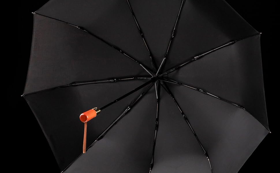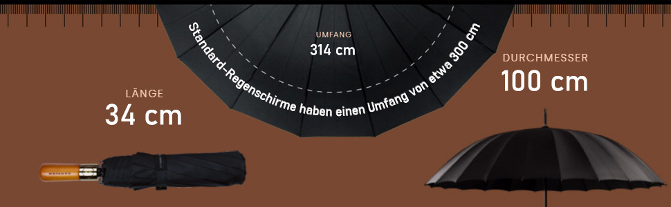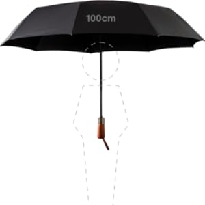 Obwohl der Schirm im geschlossenen Zustand nur 34 cm misst, entfaltet er sich zu einer beeindruckenden Spannweite von 120 cm (100 cm Breite in gerader Linie). Diese platzsparende Größe macht ihn perfekt für Geschäftsreisende und stilbewusste Nutzer:innen in der Stadt, die sich optimal vor Regen schützen möchten, ohne auf Komfort und Stil zu verzichten.