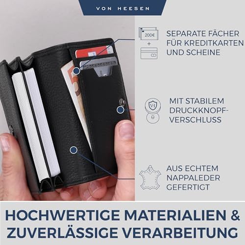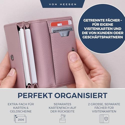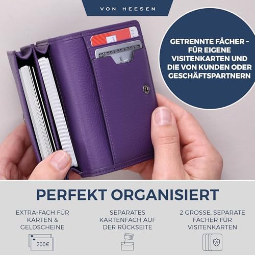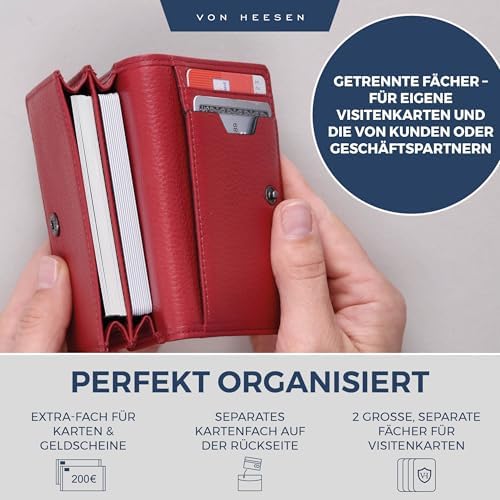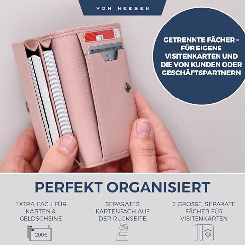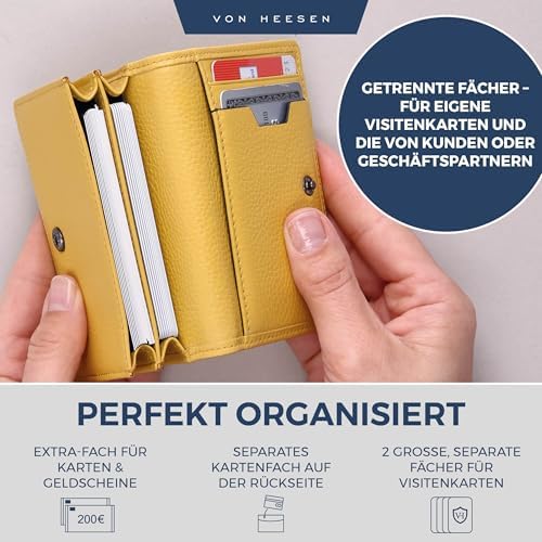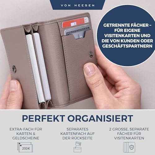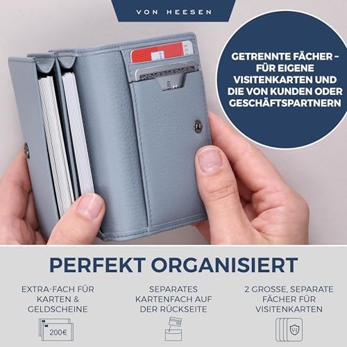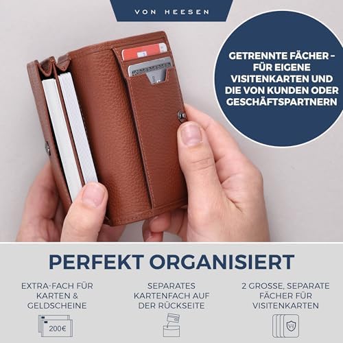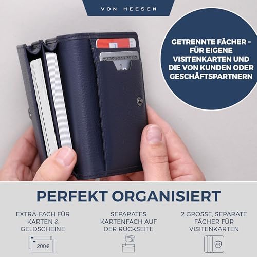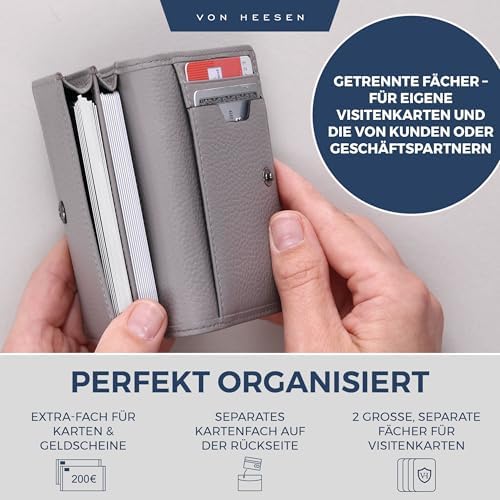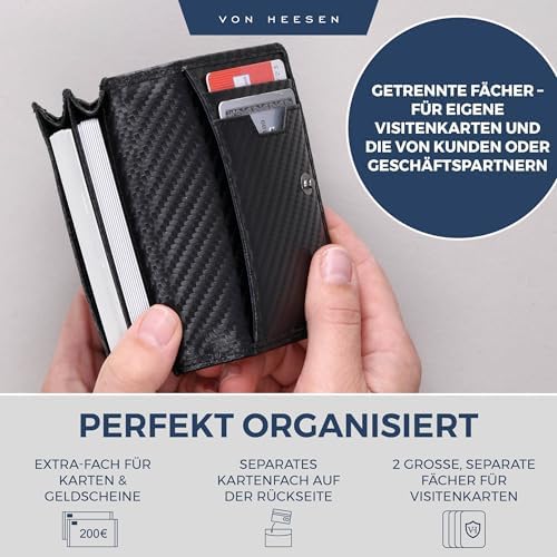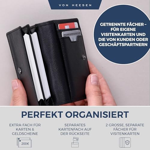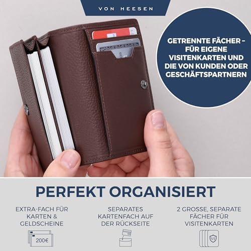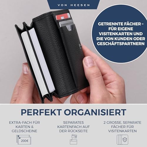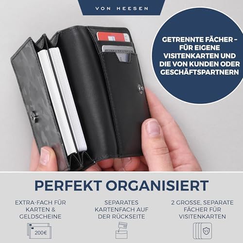 Die durchdachte Innenaufteilung des Visitenkartenhalters bietet Platz für alles Wesentliche. Mit zwei großen Hauptfächern zur getrennten Aufbewahrung von eigenen und fremden Visitenkarten sowie vier zusätzlichen Karten- und Einschubfächern für Ihre EC- und Kreditkarten, sind Sie bestens ausgestattet. Die Maße von 11×7,5×3 cm machen es kompakt und dennoch geräumig genug, um alle wichtigen Karten sicher zu verstauen.